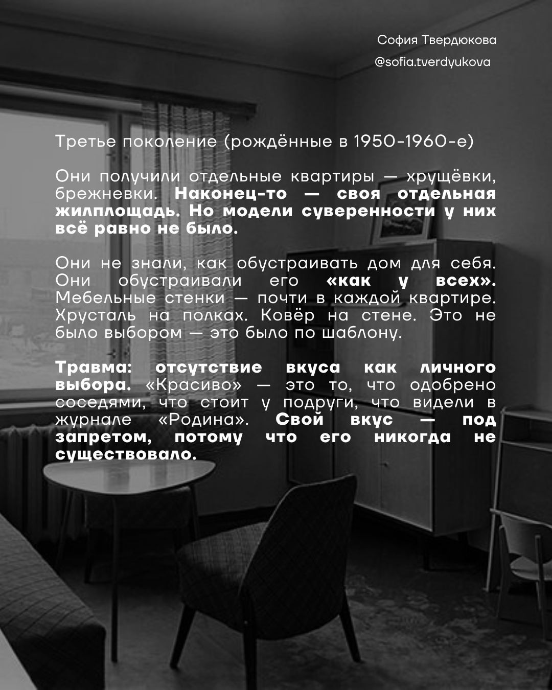 Молодые люди, скупающие советскую мебель, редко гонятся за модой. Они пытаются заштопать дыру в собственном нарративе. Им не дали безопасного дома. Им не дали устойчивых форм. Им не дали языка, чтобы сказать "моё". И теперь они собирают этот язык по осколкам — из чужих шкафов и тумбочек, надеясь, что если собрать достаточно много "настоящих" вещей, то внутри наконец поселится настоящее "я". Но вещь не заменяет историю. Она только напоминает о том, что истории нет.